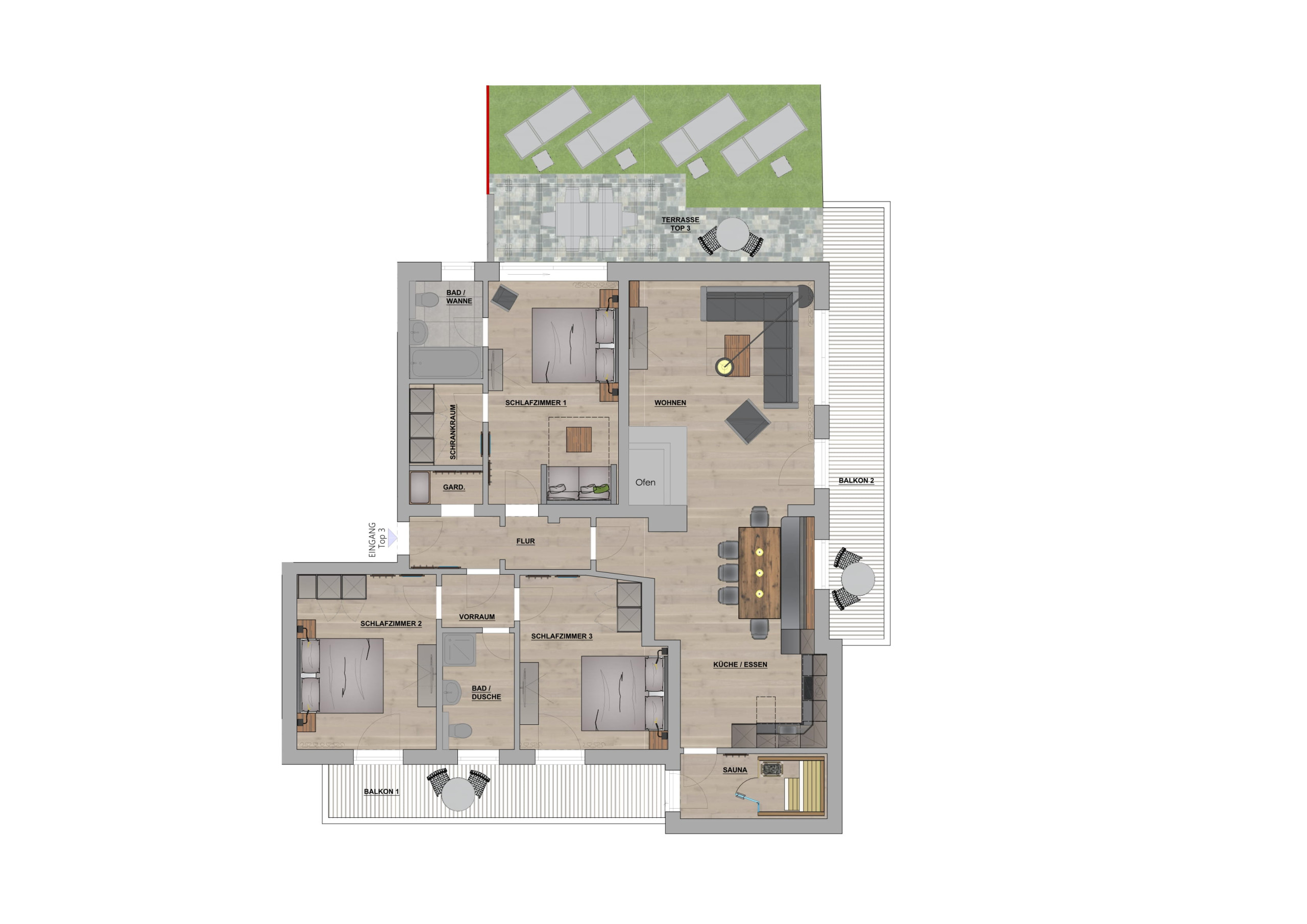 Premium Apartment – Private Sauna & Large Sun Terrace with Mountain View. 3 Bedrooms. 2 Bathrooms. 120 m². 1–10 Persons. Enjoy Your Holiday and Book at the Best Price Directly with the Owner 1508 Vermietungs GmbH & Co KG.